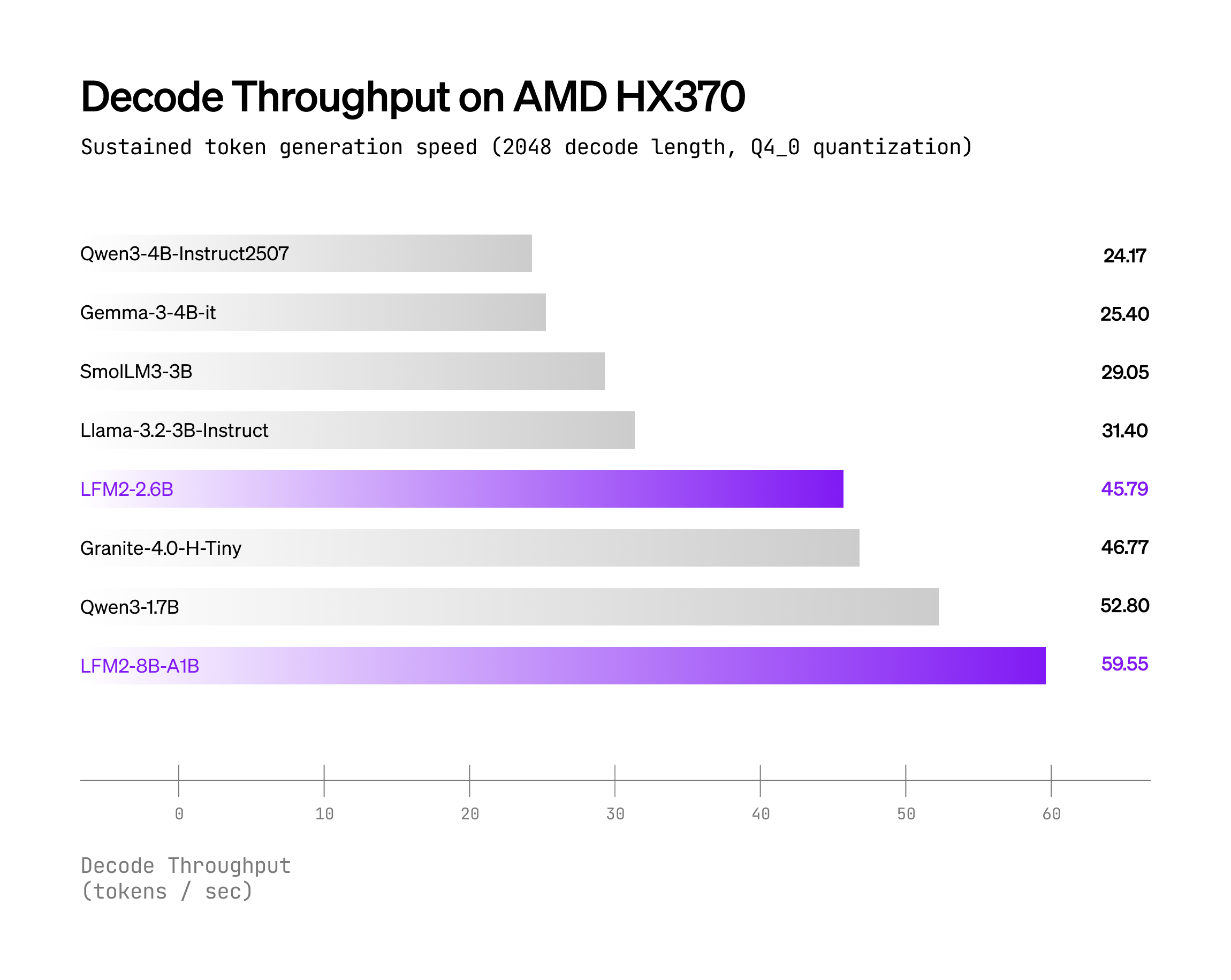 LFM2-8B-A1B is compatible with multiple inference frameworks, such as llama.cpp, ExecuTorch, and vLLM (public version coming soon). The following plots show the decode throughput with llama.cpp backend and Q4_0 quantization on two hardware targets: the Samsung Galaxy S24 Ultra (Qualcomm Snapdragon SoC) and AMD Ryzen HX370.