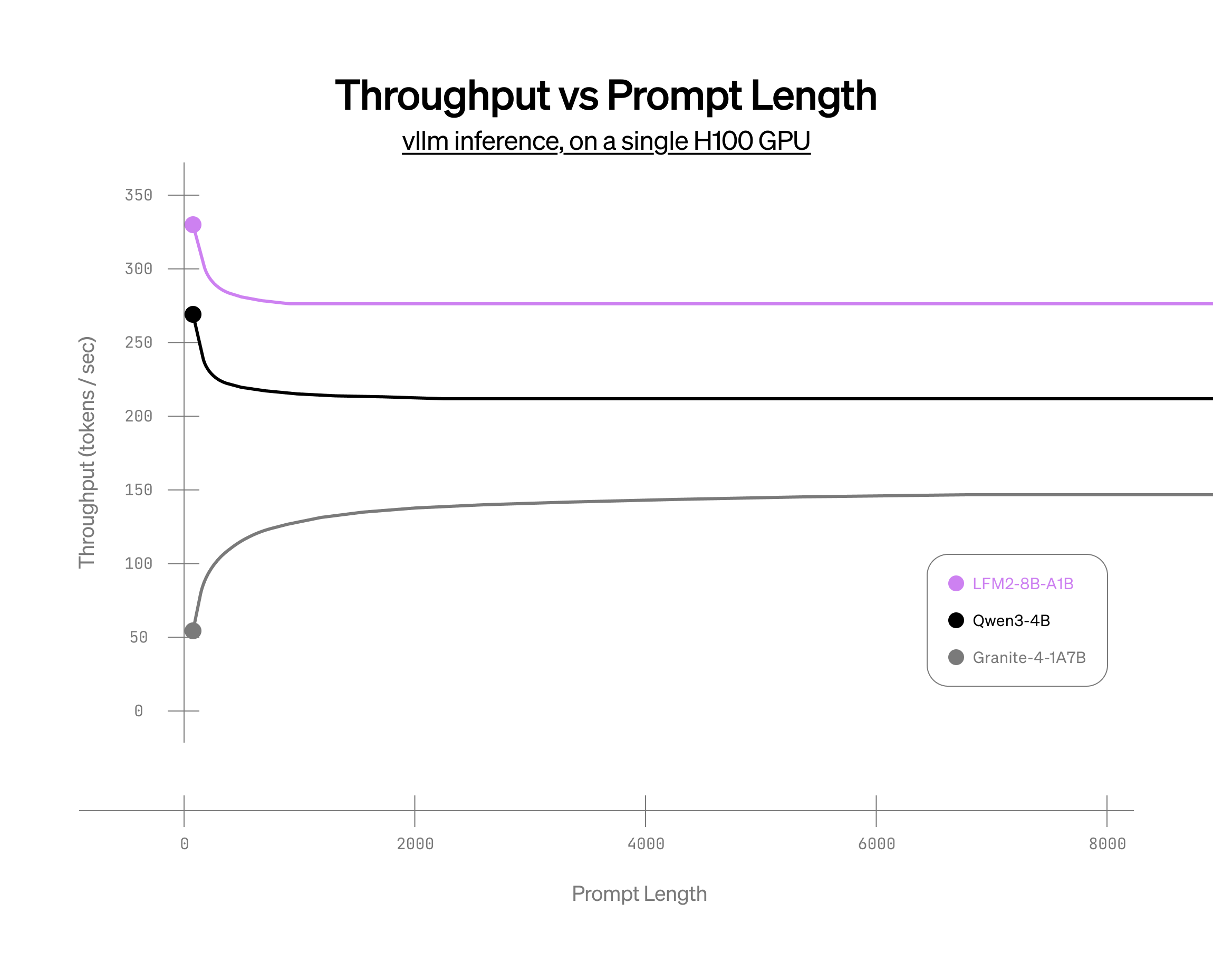 Our 8B LFM2 MoE model not only outperforms comparable size models on CPU, as seen in the above plots, but also excels against those same models on GPU (1xH100). All models above were benchmarked with the FlashInfer backend for attention layers with full CUDA-graph compilation during decode and piecewise CUDA-graph during prefill.